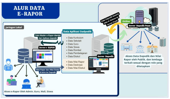 Aplikasi e-Rapor dan Dapodik terintegrasi secara lokal di setiap sekolah, artinya e-Rapor dan Dapodik dihubungkan dalam jaringan secara lokal antara aplikasi e-Rapor dan Aplikasi Dapodik Sekolah (ini dapat dilakukan dengan memasang Aplikasi Dapodik dan Aplikasi eRapor dalam 1 Komputer ataupun komputer yang berbeda).