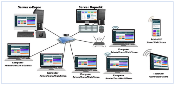 Untuk menjalankan Aplikasi e-Rapor SMK di sekolah, setiap sekolah diharapkan telah memiliki jaringan minimal Local area network (LAN) yang memadai. Berikut ini Adalah bagan jaringan LAN sekolah untuk penggunaan Aplikasi e-Rapor SMK.