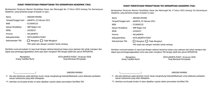 Contoh Formulir Pendaftaran TKA SMP dan SD