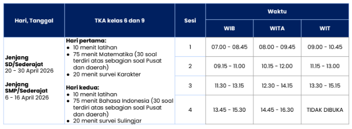 Tes Kemampuan Akademik (TKA) dilaksanakan mulai tanggal 6 – 16 April 2026 untuk jenjang SMP dan 20 – 30 April 2026 untuk jenjang SD dengan masing-masing empat gelombang untuk jenjang pendidikan formal dan satu gelombang untuk jenjang pendidikan khusus.