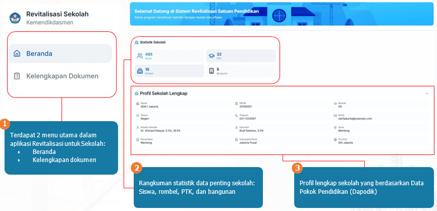 Panduan Aplikasi Revitalisasi untuk Satuan Pendidikan ini sebagai acuan bagi pengguna di dalam penggunaan Aplikasi Revitalisasi Satuan Pendidikan. Revitalisasi satuan pendidikan adalahย program pemerintah yang bertujuan untuk meningkatkan sarana dan prasarana sekolah melalui rehabilitasi, pembangunan baru, dan penyediaan fasilitas yang dibutuhkan agar tercipta lingkungan belajar yang aman, nyaman, dan berkualitas.