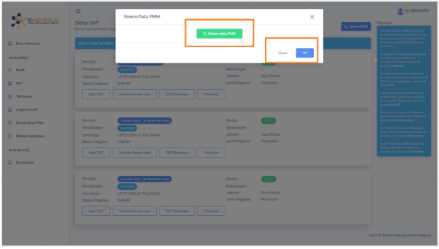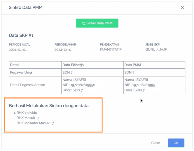 ย Di dalam kondisi ideal (tanpa perlu perbaikan data di e-Kinerja/SIASN), proses sinkronisasi data SKP dengan Ruang GTK akan berhasil tanpa catatan.