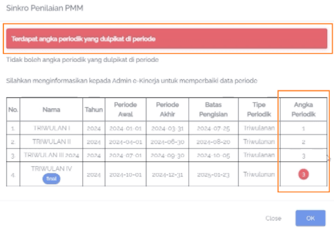 • Tindak Lanjut: Admin Instansi harus melakukan pembaruan angka periodik untuk menghilangkanย duplikasiย angka periodik.