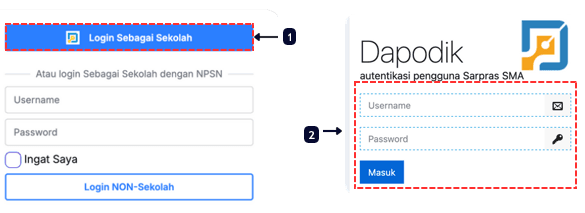 2. Pilih menu โLogin Sebagai Sekolahโ, sekolah login menggunakan Akun Dapodik Sekolah.