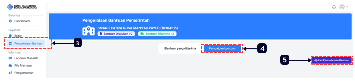 3. Setelah berhasil login, akan muncul menu dalam dashboard utama. Silakan pilih menu โPengelolaan Bantuanโ. Kemudian pilih tab โPengajuan Bantuanโ kemudian pilih โAjukan Permohonan Bantuanโ di bagian kanan atas.