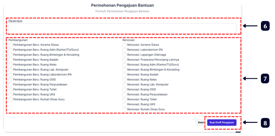 4. Sekolah memasukkan deskripsi pengajuan bantuan, kemudian memilih kategori bantuan yang diajukan, sesuai dengan proposal dan kondisi riil kebutuhan di lapangan. Sekolah dapat mencentang lebih dari 1 kategori. Terdapat 2 jenis bantuan yang dapat diajukan, yaitu โPembangunan Baruโ dan โRenovasi/Rehabilitasiโ. Jika sudah terisi semua, pilih โBuat Draft Pengajuanโ.