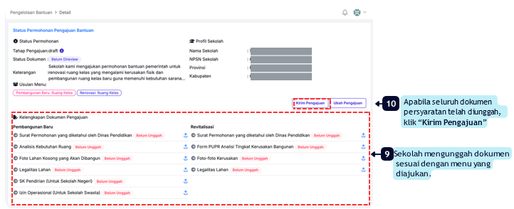 - Setelah berhasil membuat pengajuan draft bantuan, akan muncul daftar bantuan yang diajukan. Silakan melengkapi dokumen-dokumen pengajuan bantuan dengan pilih โLihat Detail Bantuanโ. Dalam menu permohonan pengajuan, akan muncul menu unggah dokumen-dokumen syarat yang harus dilengkapi oleh sekolah.