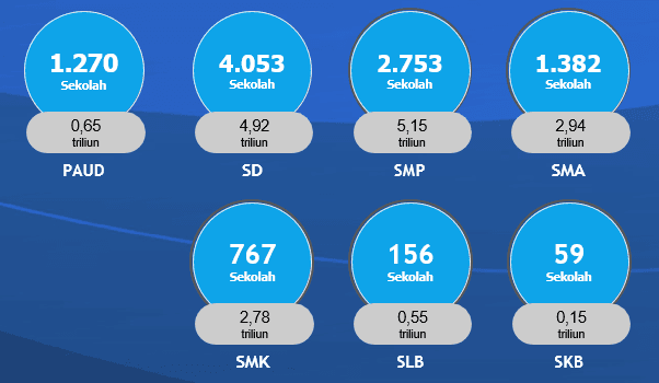 Total anggaran 17,15 Triliun untuk 10.440 satuan pendidikan dengan proporsi sasaran revitalisasi 78% negeri dan 22% swasta.