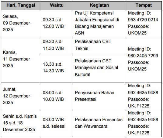 Pelaksanaan Uji Kompetensi Jabatan Fungsional di Bidang Manajemen ASN akan diselenggarakan pada tanggal 09, 11, 12, 15 s.d. 18 Desember 2025 dengan rincian sebagai berikut