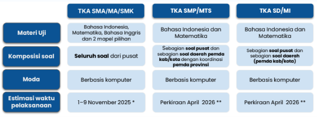 **) TKA SD dan SMP direncanakan April agar materi pelajaran tuntas dan hasilnya bisa dipakai untuk seleksi jalur prestasi ke jenjang berikutnya.