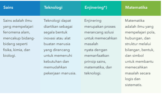 Sejak diperkenalkan oleh National Science Foundation (NSF) pada akhir 1990-an, STEM pada awalnya sekadar akronim kebijakan untuk mendukung daya saing bangsa (Blackley & Howell, 2015). Definisi untuk masing-masing terminologi tersebut dapat dilihat pada tabel berikut,