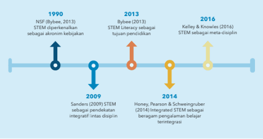 Sementara itu, Honey, Pearson, & Schweingruber (2014) menegaskan keterhubungan antardisiplin untuk membangun literasi, keterampilan abad ke-21, dan kesiapan kerja. Dengan demikian, STEM berevolusi dari sekadar akronim kebijakan menjadi kerangka pendidikan integratif dan transformatif untuk memecahkan masalah nyata. Lini masa evolusi definisi pembelajaran STEM dapat dilihat pada gambar berikut.