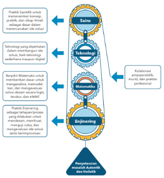 Pembelajaran STEM dalam panduan ini dipahami sebagai pembelajaran yang mengintegrasikan berbagai mata pelajaran, (tidak hanya IPA dan Matematika) serta berfokus pada pemecahan masalah nyata dalam kehidupan sehari-hari. Proses pembelajaran mencakup penyelidikan ilmiah dan siklus enjinering yang berulang, pemodelan matematis, dan pemanfaatan teknologi secara tepat guna.